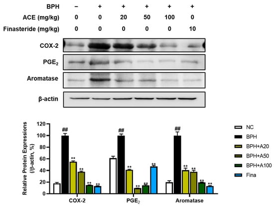 In the progression of BPH, inflammation also assumes a crucial role. COX-2, PGE2, and Aromatase were examined to explore the suppressive effects of standardized ACE on inflammatory signals. The BPH group demonstrated a notable elevation in the levels of COX-2, PGE2, and aromatase proteins when compared to the NC group (Figure 5, p < 0.01). Conversely, treatment with finasteride and ACE markedly decreased the protein levels of these markers (p < 0.01).