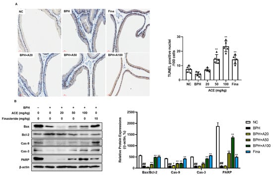 Effects of ACE (AGEprost®) treatment on TUNEL-positive cells and apoptosis-related protein expression in the TP-induced BPH rat model (bar = 30 μm). (A) Representative photomicrographs of TUNEL-stained prostate tissues of each group (magnification ×400) and the number of TUNEL-positive nuclei per 100 cells. The values for each animal are presented as a dot plot in the shape of a triangle. (B) Representative bands and normalized relative protein expressions of Bax, Bcl-2, Cas-9, Cas-3, and PARP in rat prostate tissues were analyzed using Western blotting. β-actin was used as a loading control. The protein expressions were quantified by measuring their band intensity using the ImageJ software. Values = mean ± S.D. ## p < 0.01 vs. NC group; * p < 0.05, ** p < 0.01 vs. BPH group. NC: normal control; BPH: benign prostatic hyperplasia; ACE (AGEprost®): Ageratum conyzoides extract; Fina: finasteride.