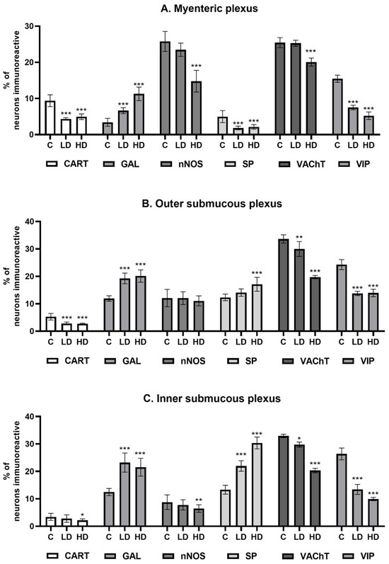 Percentage of neurons immunoreactive (A) in the myenteric plexus, (B) outer submucous plexus, and (C) inner submucous plexus. Percentage (Mean ± SEM) of neurons immunoreactive for cocaine- and amphetamine-regulated transcript peptide (CART), galanin (GAL), neuronal nitric oxide synthase (nNOS), substance P (SP), vesicular acetylcholine transporter (VAChT), and vasoactive intestinal polypeptide (VIP) of all neuronal cells immunoreactive to PGP 9.5 in the control group (C), low-dose group (LD), and high-dose group (HD) of MP-PET. * p < 0.05, ** p < 0.01, *** p < 0.001 indicate statistically significant differences in the expression of the tested substances in relation to the control group.