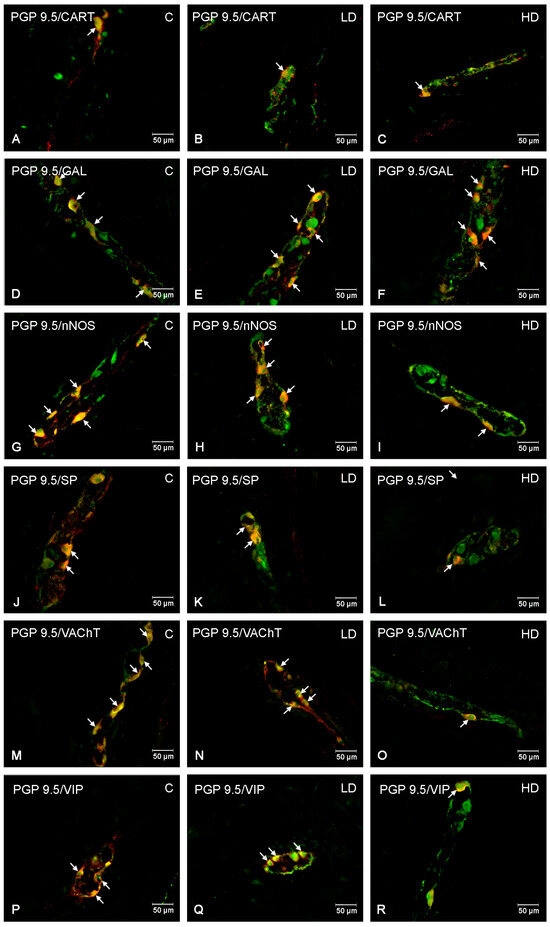 The outer submucous plexus of porcine jejunum. Fluorescence microscope image showing the distribution of neurons immunoreactive to PGP 9.5 —used as a pan-neuronal marker and CART, GAL, nNOS, SP, VAChT, and VIP in the control group—C (A,D,G,J,M,P), after administration of low (B,E,H,K,N,Q) and high doses (C,F,I,L,O,R) of MP-PET. All photographs were made by overlapping green and red fluorescent channels (green for PGP 9.5 and red for CART, GAL, nNOS, SP, VAChT, and VIP, respectively). Neurons immuno-positive to a particular substance studied are indicated with arrows.