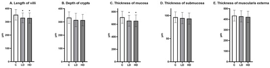 (A) The length of villi, (B) the depth of crypts, (C) the thickness of mucosa, (D) the thickness of submucosa, and (E) the thickness of the muscularis externa in the jejunum (Mean ± SD). * p < 0.05 indicate statistically significant differences in the expression of the tested substances in relation to the control group in the LD group and HD group.