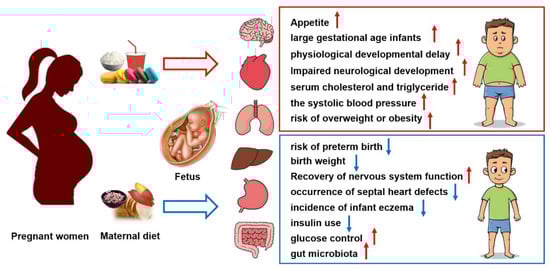 There is growing evidence suggesting that the mother’s dietary intake during pregnancy is closely related to the developmental programming of the fetus. As summarized in Table 2, improper macronutrients in the mother’s diet can lead to high blood sugar during fetal development and are associated with an increased prevalence of T2DM in adulthood [103,104]. North et al. conducted a systematic review of randomized controlled trials including 14 articles from 11 RCTS involving 3614 participants [105]. Their findings indicated that maternal diet did not significantly impact insulin, C-peptide, or glucose levels in newborns’ cord blood. However, infants born to mothers adhering to a low glycemic load (GL) diet exhibited reduced skin fold thickness. Furthermore, interventions offering personalized nutritional counseling to obese women were linked to lower obesity rates in their offspring. These results highlight the potential benefits of lifestyle-based dietary interventions in improving blood sugar levels and preventing excessive obesity [105]. As shown in Figure 1, high levels of saturated fat or refined sugar in the mother’s diet is one of the major factors in the development of obesity and metabolic syndrome in offspring. The impaired maternal metabolic status discussed above (GDM, HDP, GWG), which is caused by overnutrition or inappropriate nutritional status, affect fetal growth, birth weight, and the development of chronic metabolic diseases such as obesity in later generations.