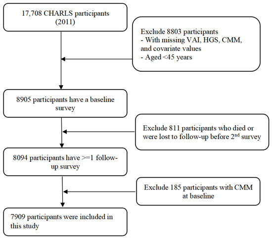 Data from the CHARLS from 2011 to 2020 was employed in the present study. Participants under 45 years old were not taken into account. Those with missing data on VAI, HGS, other variables, and CMM (the co-presence of at least two CMDs) at baseline were also excluded. Finally, 7909 participants in total were incorporated. Figure 1 illustrates the specific process of selecting respondents.
