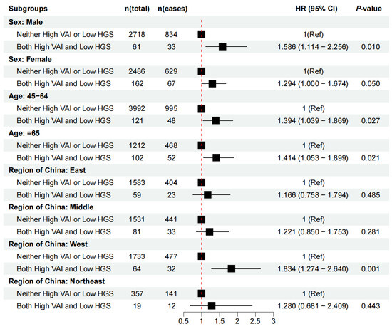Participants with a high VAI only (HR: 1.234, 95%CI: 1.119–1.362), low HGS only (HR: 1.376, 95%CI: 1.213–1.561), or with both a high VAI and low HGS (HR: 1.377, 95%CI: 1.120–1.694) possessed a greater chance of CMM risk than those with neither a high VAI nor low HGS after adjusting for all covariates (Table 3).