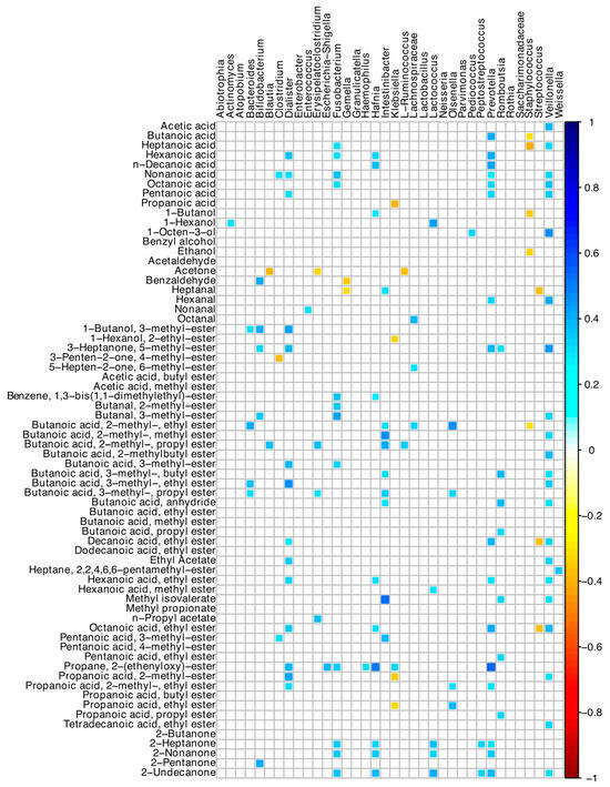 3.8. Correlations among Microbiome and Volatilome Characteristics