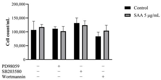 16]. Therefore, in this study, the proliferation capacity of mammary epithelial cells was tested after the inhibition of three possible SAA signalling pathways in the breast, the ERK1/2, p38 MAPK and PI3K/Akt pathways, as well as the SAA expression in response to the inhibition of its pathways.