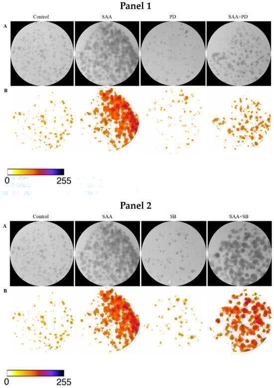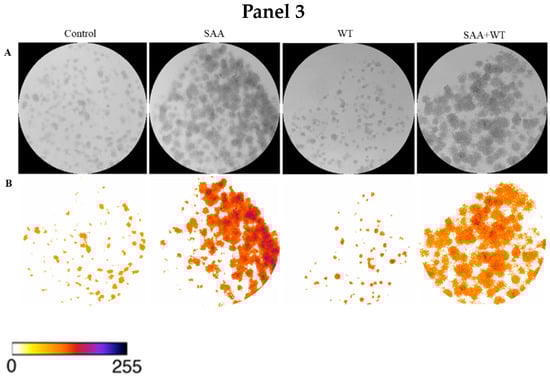 Corroborating the results found from the cell proliferation assay, there was no significant difference between the different treatments, demonstrating that there was no difference in the cell’s ability to produce colonies even when treated with SAA and inhibitors.