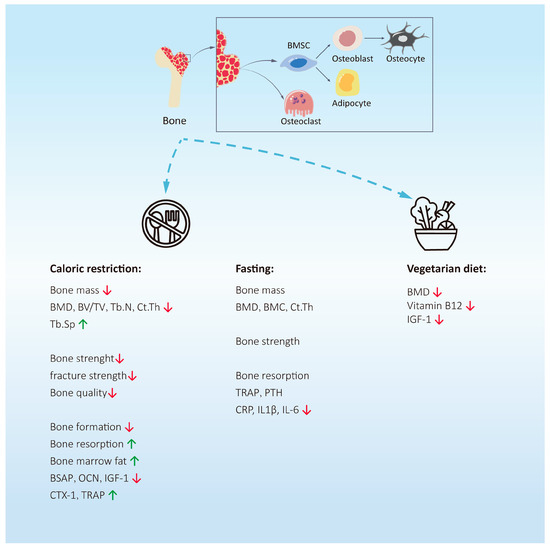 The effects of calorie restriction, intermittent fasting, and vegetarian diets on bone health. Caloric restriction can reduce bone mass and bone strength, inhibit bone formation, and promote bone resorption. The effect of fasting on bone mass is not clear. Interestingly, it can effectively reduce the expression of pro-inflammatory factors. Studies have shown that vegetarian diets may reduce bone mass by reducing the synthesis of vitamin B12 and IGF-1.Abbreviations: BMD = bone mineral density; BSAP = bone-specific alkaline phosphatase; OCN = osteocalcin; IGF-1 = insulin-like growth factor 1; CTX-1 = type I collagen carboxy-terminal peptide; TRAP = tartrate-resistant acid phosphatase; CRP = c-reactive protein; IL1β = interleukin-1β; IL6 = interleukin-6; IGF-1 = insulin-like growth factor 1. ↑ = The expression level of this substance is upregulated. ↓ = The expression level of this substance is downregulated.