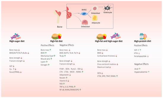 Glucose feeding for 8 weeks resulted in a lower femoral and tibial BMD, reduced ALP and total phosphorus in the bone, and decreased calcium intake in adolescent female rats, suggesting that glucose could have more deleterious effects on mineral homeostasis and bone than fructose [79]. Felice et al. [80] constructed a rat model for metabolic syndrome (MS) using a fructose-enriched diet. Significant changes were found in the femoral bone microstructure of rats with metabolic syndrome, with a 20% reduction in osteoclast density and a 30% reduction in the osteoclast-covered (TRAP-positive) bone surface of cancellous bone. These changes may have an effect on the lipogenic/osteogenic differentiation of BMSCs by regulating the Runx2/PPARγ (runt-related transcription factor 2/peroxisome proliferator-activated receptors-γ) ratio, which in turn affects the process of bone remodeling.