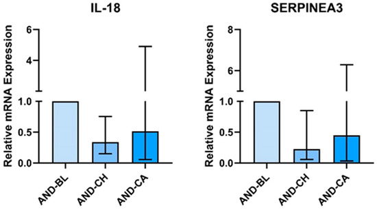AT treated with AND-CH had significantly lower IL18 mRNA expression (Gmean: 0.338, 95% CI: 0.132, 0.767) (Figure 3). There was no effect of treatment on IL18 mRNA expression in SKMC.