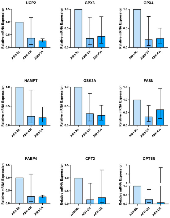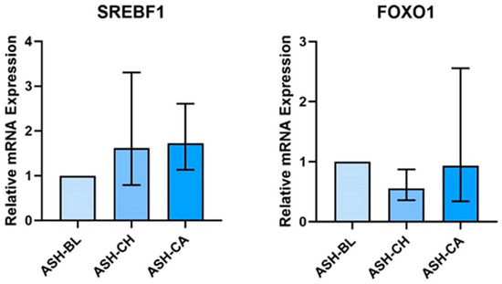 SKM cells treated with ASH-CH and ASH-CA had a higher expression of SREBF1 (ASH-CH: 1.67, 95% CI: 0.385, 2.970; ASH-CA: 1.721, 95% CI: 1.110, 2.645) and a lower expression of FOXO1 (ASH-CH: 0.564, 95% CI: 0.305, 0.855; ASH-CA: 0.924, 95% CI: 0.319, 2.585) (Figure 5). There was no effect of ASH-CH or ASH-CA on genes involved in inflammation/oxidative stress in SKM cells.