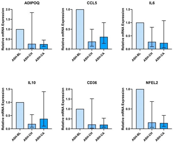 Treatment of AT with the sera of participants who supplemented with ASH-CH or ASH-CA had no effect on the mRNA expression of IL1β, IL-10, CD14, NFkB1, CCL2, MMP9, MMP14, APOE, IFNG, SOD1, SOD2, GPX1, CAT, iNOS.
