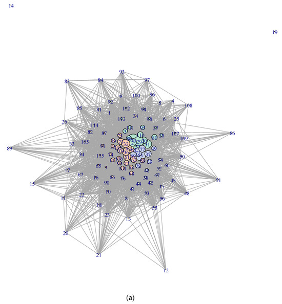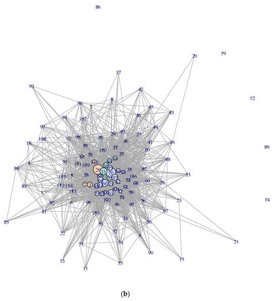 (a) Food combination network for female subjects. See Table A2 for label numbers of nodes. The size of each vertex is proportional to the sum of the degree of simultaneous intakes . (b) Food combination network for male subjects. See Table A2 for label numbers of nodes. The color of each vertex indicates the grouping of foods. The size of each vertex is proportional to the sum of the degree of simultaneous intakes .