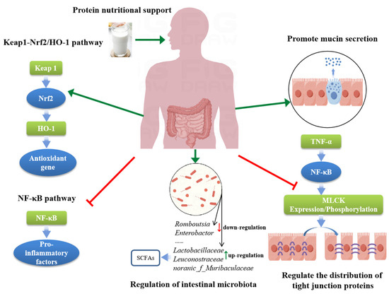 Intestinal tight junction proteins are important molecules that form tight connections between intestinal cells and play a key role in maintaining the integrity and permeability of the intestinal mucosal barrier [110]. Studies show that Occludin, Claudins, and Zonula Occluden 1 (ZO-1) are the most important three types of tight junction proteins [111,112]. When the expression or distribution of intestinal tight junction proteins are abnormal, the integrity of the intestinal mucosal barrier is damaged, and the permeability is increased, which may lead to intestinal inflammation, allergy, and other problems [113,114]. All IBD patients were accompanied by intestinal mucosal barrier impairment to varying degrees. Tumor necrosis factor-α (TNF-α) is a key inflammatory factor that leads to impaired intestinal mucosal barrier function [115]. In IBD, TNF-α increases the expression/phosphorylation of myosin light chain kinase (MLCK) by inducing NF-κB activation, which subsequently leads to the delocalization of tight junction proteins on intestinal epithelial cell membranes, ultimately resulting in increased intestinal permeability [116,117,118,119]. Many experimental studies have shown that whey protein and soy protein can significantly inhibit the expression of TNF-α in the colon of colitis animals, improve intestinal mucosal permeability, and reduce the score of colon inflammation [28,83,84,85,86,87]. Given the importance of protein, in recent years, clinical researchers have begun to consider the use of protein nutritional support in IBD. One of the clinical studies observed that a daily dose of whey protein could significantly relieve intestinal epithelial inflammation and improve intestinal permeability and intestinal mucosal morphology [30]. This evidence suggests that protein nutritional support regulates the distribution of tight junction proteins in intestinal epithelial cells by reducing TNF-α expression, thereby improving intestinal mucosal permeability.