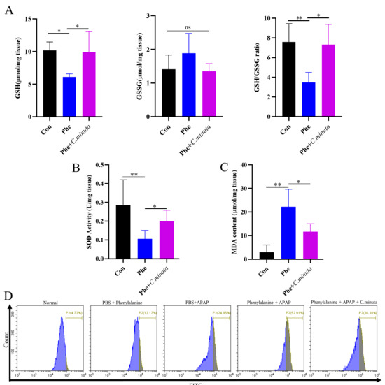 3.5. C. minuta Supplementation Improved High Oxidative Stress Levels Exacerbated by Phenylalanine in AILI