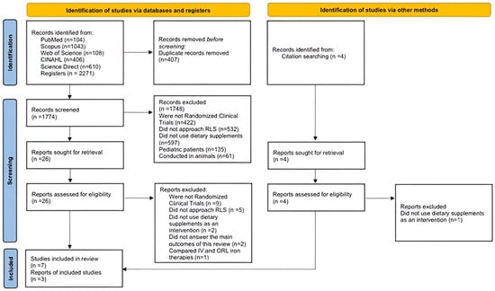 González-Parejo, P.; Martín-Núñez, J.; Cabrera-Martos, I.; Valenza, M.C. Effects of Dietary Supplementation in Patients with Restless Legs Syndrome: A Systematic Review. Nutrients 2024, 16, 2315. https://doi.org/10.3390/nu16142315