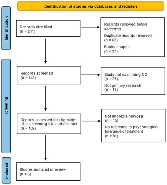 Figure 1 describes the flowchart of the papers’ selection. The research on the mentioned databases selected 241 studies meshed with the inclusion criteria. In total, 62 duplicate papers and 37 book chapters were eliminated, reaching the number of 142 studies for content analysis. In the first step, 27 papers were removed because they did not include NGT treatment, and another 13 were removed as they did not include a reference to the psychological aspects of the NGT treatment. In the second step, 102 studies were selected but 16 were removed because they did not include patients affected with AN, and, furthermore, 81 studies were removed because they did not address the psychological tolerability of the NGT. A total of 6 papers were therefore included in the present review, which addresses the psychological perception of the NGT treatment by AN participants.