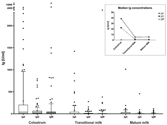 - Abuidhail, J.; Al-Shudiefat, A.A.; Darwish, M. Alterations of immunoglobulin G and immunoglobulin M levels in the breast milk of mothers with exclusive breastfeeding compared to mothers with non-exclusive breastfeeding during 6 months postpartum: The Jordanian cohort study. Am. J. Hum. Biol. 2019, 31, e23197. [Google Scholar] [CrossRef] [PubMed]