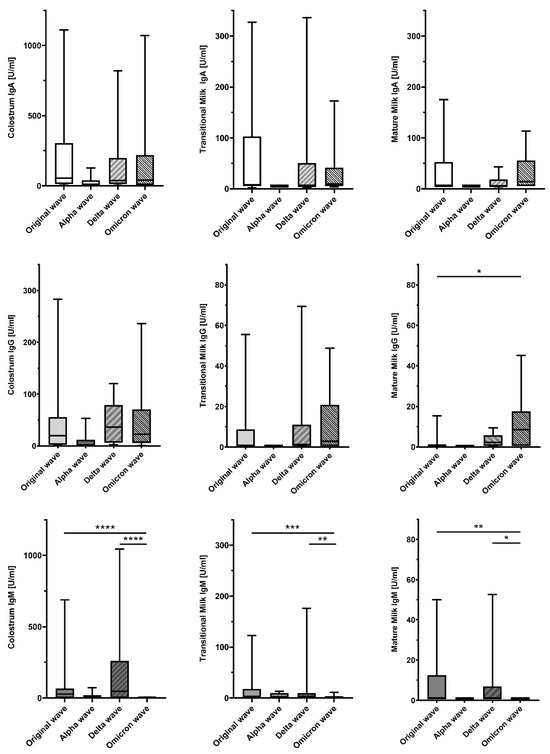| Type of Breast Milk | Virus Wave | IgA Median (Q1; Q3) | p-Value * | IgG Median (Q1; Q3) | p-Value * | IgM Median (Q1; Q3) | p-Value * |