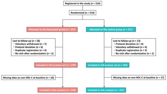 This was a post hoc analysis of the PRIZE study, a prospective, open-label, blinded-endpoint trial (University Hospital Medical Information Network Clinical Trial Registry, UMIN000012911 and UMIN000041322). The study’s protocol and design are available in previous reports [9]. Briefly, patients who had asymptomatic hyperuricemia (SUA levels >7.0 mg/dL) and a maximum intima–media thickness (IMT) of the common carotid artery (CCA) of ≥1.1 mm at screening were eligible for the PRIZE study. Patients were excluded if they received SUA-lowering medications within 8 weeks before the eligibility assessment, and if they had gouty tophus or symptoms of gouty arthritis within 1 year prior to the assessment. Participants with hyperuricemia and significant carotid plaques in the PRIZE study were randomly assigned to the febuxostat group or the control (no intervention) group, and they also implemented appropriate lifestyle modifications for hyperuricemia. Randomization was stratified according to age, sex, presence of diabetes, SUA levels, and maximum CCA-IMT. In the febuxostat group, patients were treated with an initial daily dose of 10 mg, followed by an increased dose of 20 mg at the 1-month timepoint and 40 mg at the 2-month timepoint, if tolerated. Although a daily dose of 40 mg was the targeted maintenance dose, a daily dose of 60 mg was allowed at 3 months or later. In the control group, the intervention solely involved appropriate lifestyle modifications. Patients with missing data regarding non-HDL-C levels at baseline were also excluded (Figure 1).