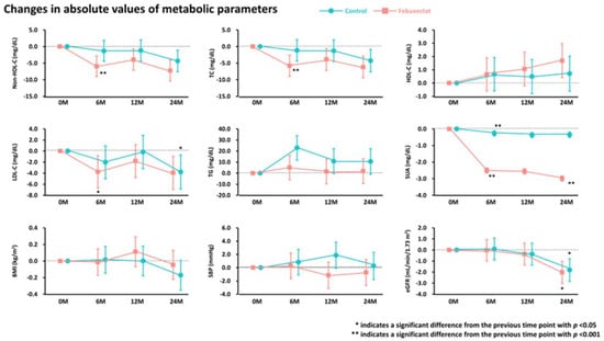The present study has limitations. The PRIZE study is a prospective RCT, and this sub-analysis was conducted in a post hoc manner. Owing to the open-label design of the PRIZE study, treatment decisions may have been affected by study allocation; however, the details of the medications for dyslipidemia were balanced between the febuxostat and control groups. Although the close relationships of metabolic syndrome and dyslipidemia to inflammation are well-known [20], the present study did not evaluate inflammatory biomarkers such as C-reactive protein. We used the first 6 months of the study period to evaluate febuxostat’s pharmacological potential in relation to lipid profiles, but no significant differences in these parameters were found between the two groups at 24 months (Table S1). However, non-HDL-C levels were consistently lower in the febuxostat group than in the control group during the 24-month follow-up period, and no remarkable changes in cardiometabolic parameters were observed after 6 months. Participants in the PRIZE study had asymptomatic hyperuricemia and carotid plaques (CCA-IMT ≥1.1 mm at screening), which is a predictor of cardiovascular events [21,22]. Therefore, it is uncertain whether our results can be extrapolated to other populations.