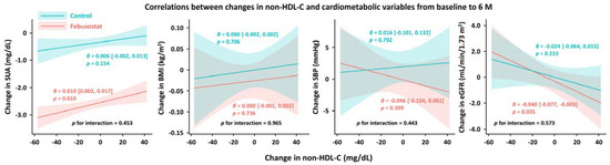 From baseline to 6 months, non-HDL-C, total cholesterol, LDL-C, and SUA levels were significantly reduced in the febuxostat group, but not in the control group (Figure 2). No significant changes were found in other cardiometabolic variables, such as HDL-C levels, triglycerides, SUA levels, BMI, SBP, and eGFR, at the 6-month follow-up (Figure 2). Between-group differences in non-HDL-C, total cholesterol, triglyceride, and SUA levels from baseline to the 6-month follow-up were significant (Table 3). Subgroup analysis revealed that the non-HDL-C-lowering effect was likely to be greater in women treated with febuxostat (Figure 3). Changes in non-HDL-C levels from baseline to 6 months were significantly correlated with changes in SUA levels and eGFR in the febuxostat group, but not in the control group (Figure 4). The between-group interactions were not significant for the correlation of changes in non-HDL-C levels with changes in SUA levels, BMI, SBP, and eGFR (Figure 4). Similarly, changes in non-HDL-C levels from baseline to the 6-month follow-up were significantly correlated with changes in SUA levels and eGFR in the febuxostat group, but not in the control group (Figure S1).