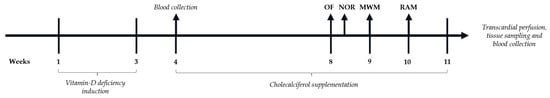 Afterward, the animals were randomly divided into three groups receiving various diets. The vitamin D deficient group (VDD, n = 12) continued to receive a vitamin D-free diet; the second group (LVD, n = 12) was supplemented with low vitamin D dose (cholecalciferol 1000 IU/kg included in the standard diet); the third group (HVD, n = 12) received a higher dose of cholecalciferol (10,000 IU/kg in the diet). The cholecalciferol dose selection was based on previous studies in rats, where significant effects on cognitive performance were described [,]. Specific dietary formulas were given for a 7-week period, in which the cognitive abilities of the animals were assessed by subjecting them to behavioral tests. The comprehensive timeline for this experiment can be seen in Figure 1.