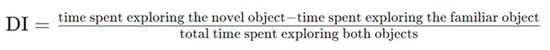 Following each test, the arena was thoroughly cleaned with 70% ethanol solution. The exploration time was defined as sniffing or touching the object with the nose and was quantified afterward. The discrimination index was calculated for the retention trials using the formula presented in Figure 2.