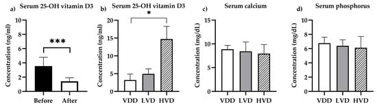 Vitamin D status and blood chemistry. (a) Serum levels of 25-OH vitamin D3 before (day 1) and after 4 weeks (day 28) of starting paricalcitol administration (n = 6); (b) serum levels of 25-OH vitamin D3 after 7 weeks of special diet administration; (c) serum calcium levels at the end of the experiment; (d) Serum phosphorus levels at the end of the experiment. Legend: VDD—vitamin D deficient group (n = 12), LVD—vitamin D deficient group supplemented with a special diet containing 1000 IU/kg cholecalciferol (n = 12), HVD—vitamin D deficient group supplemented with a special diet containing 10,000 IU/kg cholecalciferol (n = 12), *—p < 0.05, ***—p < 0.001.
