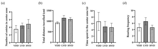 Assessment of locomotion and anxiety-like behavior in the open field test. (a) The number of entries in the center zone, defined as a 30 × 30 cm2 out of a 60 × 60 cm2 total surface of the arena; (b) the total distance travelled by the animal during the trial; (c) the total time spent in the center zone of the arena; (d) the vertical exploration of the animals was measured by counting the number of supported rearings during the 5-min-long trial. Data are expressed as mean ± SEM. Legend: VDD—vitamin D deficient group (n = 12), LVD—vitamin D deficient group supplemented with special diet containing 1000 IU/kg cholecalciferol (n = 12), HVD—vitamin D deficient group supplemented with special diet containing 10,000 IU/kg cholecalciferol (n = 12).