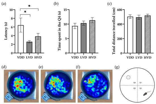 Assessment of spatial learning and memory in the testing phase of the Morris water maze. (a) Latency to reach the former platform location; (b) time spent in the target quadrant, which was the fourth quadrant of the tank; (c) total distance travelled during the 30-s retention swimming trial; (d–f) heatmap representation of swim paths of all three experimental groups. The heatmaps are based on the tracking data from Ethovision where the subject’s position is given by an x, y coordinate for each time point. Red color indicates that more time was spent in that area while blue color indicates less time; (g) schematic representation of the Morris water maze tank with the former platform location (grey circle surrounded by a dashed line) and the animal’s starting position (rat) marked. Data are expressed as mean ± SEM. Legend: VDD—vitamin D deficient group (n = 12), LVD—vitamin D deficient group supplemented with a special diet containing 1000 IU/kg cholecalciferol (n = 12), HVD—vitamin D deficient group supplemented with a special diet containing 10,000 IU/kg cholecalciferol (n = 12). Asterisk indicates the statistical significance level of * p < 0.05. The four quadrants in the water maze were denoted as Q1, Q2, Q3, and Q4.
