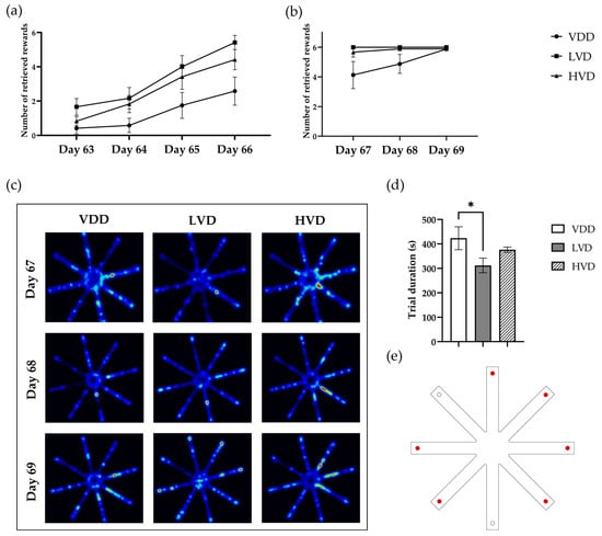 Results of the RAM test. (a) The number of collected food rewards during the training phase of the RAM test; (b) the number of collected food rewards during the testing phase of the RAM test; (c) heatmap visualization of the track plots of each experimental group across the three testing days. The heatmaps are based on the tracking data from Ethovision where the subject’s position is given by an x, y coordinate for each time point. Blue indicates that the rat spends less time in that area of the maze, while red demarcates where the rat spends the majority of its investigative time; (d) trial duration; (e) schematic representation of the radial arm maze with the sequence of baiting marked (red dot, baited arm; clear dot, unbaited arm). Data are expressed as mean ± SEM. Legend: VDD—vitamin D deficient group (n = 12), LVD—vitamin D deficient group supplemented with a special diet containing 1000 IU/kg cholecalciferol (n = 12), HVD—vitamin D deficient group supplemented with a special diet containing 10,000 IU/kg cholecalciferol (n = 12). Asterisk indicates the statistical significance level of * p < 0.05.
