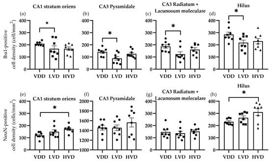 Microglial (Iba1-positive) and neuronal (NeuN-positive) cell density in the hippocampal subregions of vitamin D deficient and cholecalciferol-supplemented rats. In (a) the stratum oriens of the cornu Ammonis 1 subregion, (b) the stratum pyramidale, (c) the radiatum and lacunosum moleculare of the cornu Ammonis 3, and (d) in the hilus of the dentate gyrus, significant differences in microglia cell density were found. Conversely, neuron cell density displayed significant differences in (e) the stratum oriens of the cornu Ammonis 1 subregion and (h) in the hilus of the dentate gyrus, while (f) the stratum pyramidale, (g) the radiatum and lacunosum moleculare of the cornu Ammonis 3 did not differ. Data are expressed as mean ± SEM (n = 8). Legend: CA1—cornu Ammonis 1, CA3—cornu Ammonis 3, VDD—vitamin D deficient group, LVD—vitamin D deficient group supplemented with a special diet containing 1000 IU/kg cholecalciferol, HVD—vitamin D deficient group supplemented with a special diet containing 10,000 IU/kg cholecalciferol, *—p < 0.05.