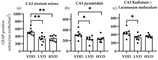 Astrocyte (GFAP-positive) cell density in the hippocampal subregions of vitamin D deficient and cholecalciferol-supplemented rats. All layers of the cornu Ammonis 3 subregion, (a) the stratum oriens, (b) the pyramidale, (c) the radiatum and lacunosum moleculare displayed significant differences between groups. Data are expressed as mean ± SEM (n = 8). Legend: CA3—cornu Ammonis 3, VDD—vitamin D deficient group, LVD—vitamin D deficient group supplemented with a special diet containing 1000 IU/kg cholecalciferol, HVD—vitamin D deficient group supplemented with a special diet containing 10,000 IU/kg cholecalciferol, *—p < 0.05, **—p < 0.01.