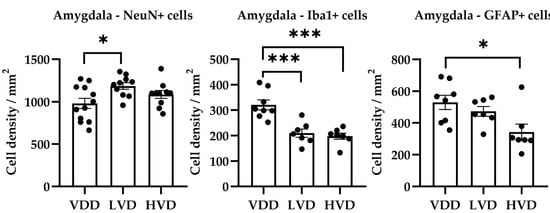 Neuronal (NeuN-positive), microglial (Iba1-positive), and astrocytic (GFAP-positive) cell density in the amygdala of vitamin D deficient and cholecalciferol-supplemented rats. Data are expressed as mean ± SEM (n = 8–12). Legend: VDD—vitamin D deficient group, LVD—vitamin D deficient group supplemented with a special diet containing 1000 IU/kg cholecalciferol, HVD—vitamin D deficient group supplemented with a special diet containing 10,000 IU/kg cholecalciferol, *—p < 0.05, ***—p < 0.001.