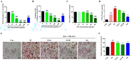 Hepatic steatosis was induced by treating hepatocytes with FC and the inhibition of lipid accumulation by LO was evaluated. The lipid content was increased by FC treatment but decreased by LO treatment (p < 0.001) (Figure 2E,F).