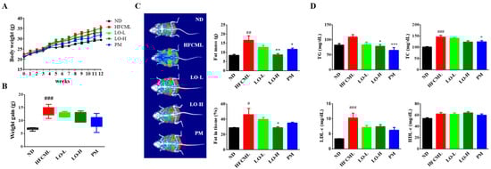 The body weight was monitored weekly over a period of 12 weeks to assess changes in body weight. The HFCML group exhibited significantly higher values compared to the ND group. Moreover, a significant increase in fat percentage was noted in the HFCML group compared to the ND group (p < 0.001). However, the LO group showed a reduction in body weight and fat percentage (Figure 3A–C). As expected, serum triglyceride, total cholesterol, and LDL-c levels were significantly elevated in the HFCML group than in the ND group (p < 0.01). However, these increases in the HFCML group decreased in the LO group (Figure 3D). High-density lipoprotein cholesterol (HDL-c) did not show any significant changes in any of the groups (Figure 3D).