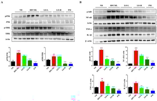 MAPK/NF-κB pathway plays a pivotal role in NAFLD and insulin resistance. Activation of this pathway by AGEs binding to RAGE influences hepatic lipid deposition, insulin resistance, inflammation, and fibrosis []. As LO alleviates CML-induced NAFLD, we explored the effect of LO on the MAPK/NF-κB signaling pathway. HFCML significantly increased Jun N-terminal kinase (JNK) phosphorylation by 2.3-fold and extracellular signal-regulated kinase (ERK) by 1.5-fold compared to ND (Figure 6A). LO attenuated the phosphorylation of JNK and ERK compared to HFCML (p < 0.001). In addition, phosphorylation of IκB was increased in HFCML, whereas it was downregulated by LO (p < 0.001) (Figure 6B). NF-κB activation was elevated in HFCML compared to ND (p < 0.001). In contrast, LO was suppressed, particularly in the LO-H group (p < 0.001) (Figure 6B). The LO group showed a significant decrease in TNF-α and IL-1β expression compared with the HFCML group (p < 0.01) (Figure 6B). The LO group showed a significant decrease in the expression of TNF-α and IL-1β compared with the HFCML group (p < 0.01) (Figure 6B). These results suggest that LO downregulated the MAPK/NF-κB signaling pathway.
