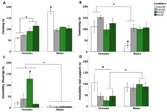 Effect of supplementation, sex, and environment in the forced swim test (FST) on time spent climbing (A), swimming (B), immobility by floating (C), and immobility by tail support (D). Increased climbing was observed for CSO/RC males compared to all groups (p < 0.001; #). FO Females climbed more than CSO regardless of the environment (p < 0.001; *; (A)). Swimming was enhanced in CSO-fed females compared to male counterparts in both RC and EE (p < 0.001; *). Male CSO/RC rats show reduced swim compared to all groups (p < 0.01, #; (B)). Immobility was increased in FO/RC females compared to all groups (p < 0.001; #; (C)). Male rats fed FO used tail support to maintain immobility (p = 0.001; *), while female counterparts preferred floating (p < 0.001; #; (D)). Data are presented as mean ± S.E.M. * and # indicate significant differences between groups at p < 0.05. * indicates significant impact of supplementation only (p < 0.05). FO: menhaden fish oil; CSO: control soybean oil; EE: enriched environment; RC: regular cage.