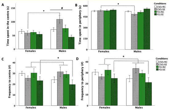 Effect of supplementation, sex, and environment in the Open Field Test (OFT) for time spent in the centre (A), time spent in the periphery (B), frequency to centre (C), and frequency to periphery (D). Male rodents spent more time in the centre zone compared to females (p < 0.05; #). CSO/EE males spent increased time in the centre zone (A), while females in the same condition spent increased time in the periphery ((B); p < 0.05; *). Rats in the FO/RC and CSO/EE group also entered more frequently the centre (C) and peripheral zone (D) compared to the FO/EE condition (p < 0.05; *). Data are presented as mean ± S.E.M. * and # indicate a statistically significant difference between groups (p < 0.05). * indicates significant impact of the condition (supplementation and housing only) with no effect of sex (p < 0.05). FO: menhaden fish oil; CSO: control soybean oil; EE: enriched environment; RC: regular cage.