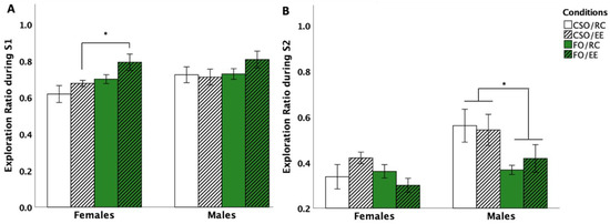 SIT data were analysed using chamber exploration time ratios. Changes in sociability involved a ratio calculated from time spent interacting with S1 versus total exploration time (S1 and empty cup exploration) [i.e., TS1/(TS1 + TEC)]. Statistical analyses revealed the main effects of supplementation [F (1,56) = 7.546, p = 0.008, η2p = 0.129] and environment [F (1,56) = 4.005, p = 0.050, η2p = 0.090]. Overall, post hoc comparisons showed the FO diet to promote exploration of S1 compared to EC (p = 0.05). No main effect of sex emerged. However, due to an a priori interest in sex differences [55] in the context of this study, planned comparisons were performed, which showed increased time exploring S1 versus EC in FO-fed females compared to CSO-fed counterparts. In males, no significant changes in sociability were noted (see Figure 5A).