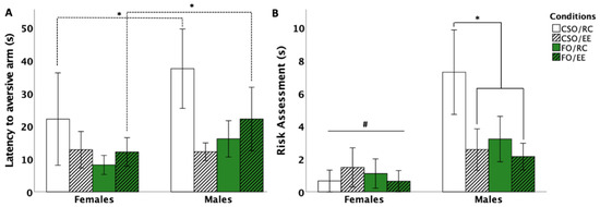 Effect of supplementation, sex, and environment for latency to arm re-entry (A) and Risk assessment behaviour (B) in the Y-maze passive avoidance test. In general, males CSO/RC and FO/EE took more time to re-enter the aversive arm compared to females in the same condition (p < 0.05; *; (A)). In males, CSO/EE and FO/EE showed reduced assessments compared to the CSO/RC condition (p < 0.05; *). Females underwent fewer risk assessments compared to males (p < 0.05; #; (B)). Data are presented as mean ± S.E.M. * and # indicate a statistically significant difference between groups at p < 0.05. FO: menhaden fish oil; CSO: control soybean oil; EE: enriched environment; RC: regular cage.