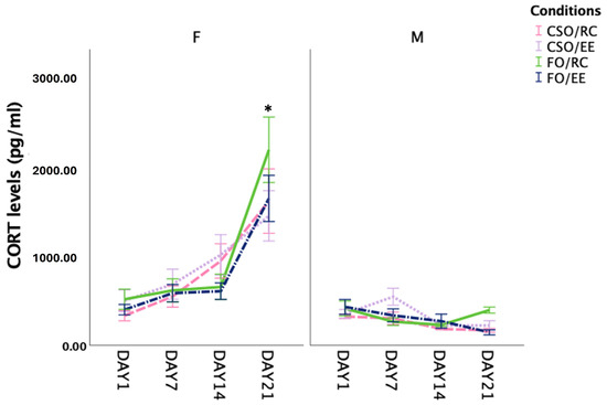 Corticosterone levels (pg/mL) assessed on experimental DAY1, 7, 14, 21. Statistical increases in CORT were observed for all females compared to males on DAY21 (p < 0.001) as well as between females from DAY1, 7, and 14 (p < 0.001 for each day). Data are presented as mean ± S.E.M. * indicates a statistically significant difference between groups at p < 0.05. FO: menhaden fish oil; CSO: control soybean oil; EE: enriched environment; RC: regular cage.