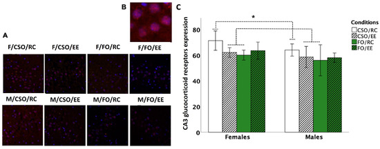 GR-ir at the CA3 region of the hippocampus. Figure shows representative photomicrographs of GR-ir in the CA3 for each experimental condition (A) as well as specificity of GR antibody through superposition on Hoechst adenine–thymine-binding dye (B). Reduced GR-ir was observed in CSO/EE and FO/RC groups compared to CSO/RC rats (p = 0.019 and p = 0.005, respectively; (C)). Data are presented as mean ± S.E.M. * indicates effects of supplementation and housing without effects of sex (p < 0.05). FO: menhaden fish oil; CSO: control soybean oil; EE: enriched environment; RC: regular cage; GR: glucocorticoid receptors.