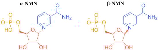 Nicotinamide mononucleotide (NMN) is a naturally occurring vitamin B derivative that is a bioactive nucleotide with a molecular weight of 334.221 g/mol [1,2]. It exists in α and β forms (Figure 1), but only the latter has biological activity. NMN occurs naturally in some vegetables (0.25–1.88 mg/100 g) and fruits (0.26–1.60 mg/100 g), including edamame, cabbage, cucumber, broccoli, tomato, mushrooms, and avocado [3]. In addition, raw beef and shrimp also contain a small amount of NMN (0.06–0.42 mg/100 g). In vivo, NMN is mainly located in red blood cells, and the amounts required to maintain normal physiological functions can be obtained from the daily diet [4].