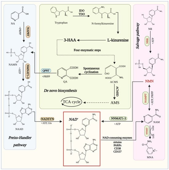 NA: nicotinic acid; NAPRT, nicotinic acid phosphoribosyltransferase; NAMN, nicotinic acid mononucleotide; NMNAT, NAMN transferase; NAAD, nicotinic acid adenine dinucleotide; NADSYN, NAD+ synthase; IDO, indoleamine 2,3-dioxygenase; TDO, tryptophan 2,3-dioxygenase; 3-HAA, 3-hydroxyanthranilic acid; ACMS, α-amino-β-carboxymuconate-ε-semialdehyde; QA, quinolinic acid; QPRT, quinolinate-phosphoribosyltransferase; ACMSD, ACMS decarboxylase; AMS, α-amino-β-muconate-ε-semialdehyde; NR, nicotinamide riboside; NRK, nicotinamide riboside kinase; NAM, nicotinamide; NAMPT, nicotinamide phosphoribosyltransferase; NMN, nicotinamide mononucleotide; NMNAT, nicotinamide mononucleotide adenylyltransferase; NNMT, nicotinamide N-methyltransferase; SAM, S-adenosyl-L-methionine; SAH, S-adenosyl-L-homocysteine; MNA, 1-methyl nicotinamide; and NAD+, nicotinamide adenine dinucleotide