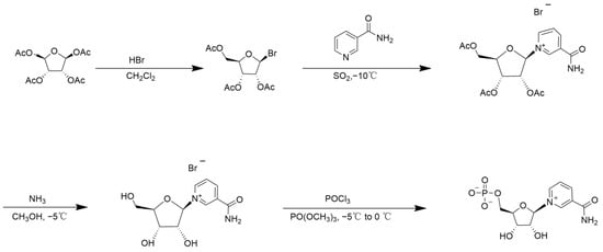 Ribose protected by acetyl or benzoyl groups can be brominated or chlorinated, and the protective group can then be removed through hydrolysis to yield NMN. Mikhailopulo et al. [20] utilized tribenzoyl-β-D-ribose as the starting material, which was first brominated with hydrobromide, and the bromine was subsequently replaced with nicotinamide. The benzoyl group was then eliminated under alkaline conditions, followed by phosphorylation using phosphorus trichloride/trimethyl phosphate to produce β-NMN. This method involves four steps and affords a total yield of approximately 31%. Based on the aforementioned route, Lee et al. [21] utilized tetraacetyl ribose and subjected it to bromination with hydrobromic acid, followed by nicotinamide substitution to generate nicotinamide triacetate. Subsequently, the acetyl group was eliminated using ammonia, and ultimately, β-NMN was obtained through phosphorylation with phosphorus oxychloride/trimethyl phosphate, followed by purification via resin chromatography. The overall yield amounted to approximately 57%, with purity exceeding 97% (Figure 3).