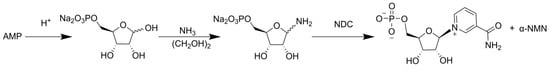 In the TMSOTf approach, nicotinamide is silanized and condensed with hydroxyl-protected ribose in the presence of TMSOTf, which generates the β-nucleoside with high stereoselectivity. Then, the nicotinamide is deprotected by NH3 or MeOH and hydrolyzed to NMN [22,23]. Compared with the previous approaches, this method shortened the reaction time and increased the stereoselectivity, while solvent utilization and product extraction were relatively simple, with a high yield of NMN (Figure 4). In the hydrolysis of adenosine monophosphate (AMP) under acidic conditions, ribose-5-phosphate is first formed, which is subsequently treated with anhydrous ammonia in dry ethylene glycol to yield ribose-5-phosphate amine. This intermediate compound is then reacted with l-(2,4-dinitrophenyl)-3-carbamoylpyridinium chloride (NDC) to produce NMN (α:β = 2:3) [24,25,26]. However, this method involves harsh reaction conditions and requires anhydrous intermediate steps, resulting in a higher proportion of the inactive α isomer (Figure 5).