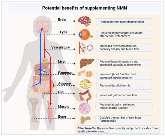 Potential benefits of NMN supplementation. As a supplemental precursor of NAD+, NMN has a modulating effect on the aging-related deterioration of physical function or diseases, including preventing cognitive decline, improving tissue and organ function, improving metabolic health, reducing inflammation, and increasing physiological benefits, which together may extend a patient’s healthy and overall lifespan.