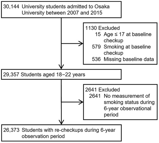 A total of 30,144 university students who entered Osaka University, one of Japan’s largest national universities, between 2007 and 2015 were eligible for this study. These participants underwent baseline health checkups on admission in either April or October. We excluded 15 (0.1%) students aged ≤ 17 years on admission, 579 (1.9%) smokers at the baseline health checkups on admission, 536 (1.8%) students with missing baseline checkup data, and 2641 (8.8%) with no answer to the smoking question during the annual health checkups over the 6-year observation period after the baseline health checkups. Lastly, we included 26,373 (87.5%) students in the analysis to assess the association between skipping breakfast and smoking initiation (Figure 1).